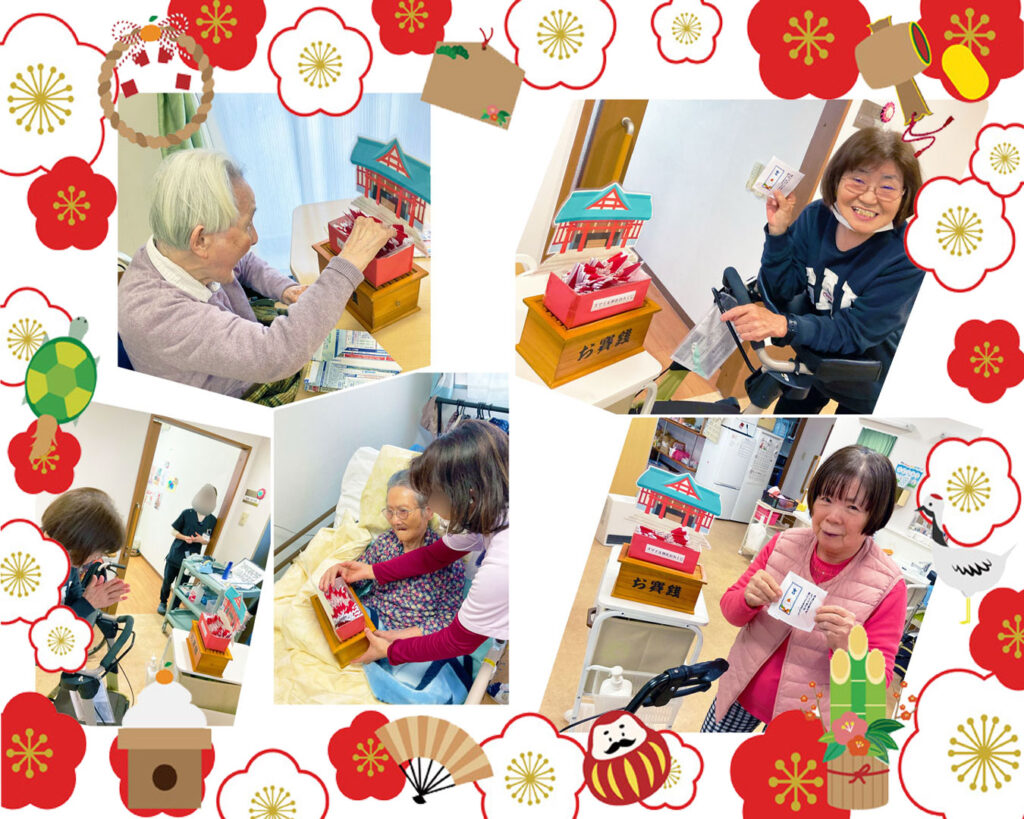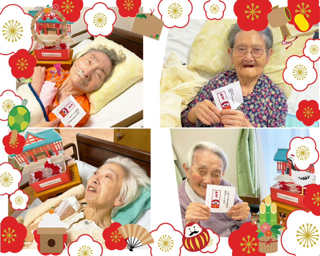 また、ベッド上で過ごされているご入居者様にも季節行事を感じていただけるよう、スタッフが工夫を凝らし、それぞれの居室でもおみくじを引いていただきました。